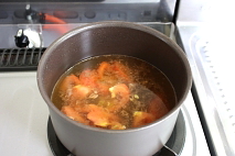 トマトが少し柔らかくなった時に、水を入れて、強火で沸騰させる。 |