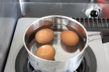 卵を冷たい水で茹でる。 水を沸騰したら、弱火で3分。 火を消した後、そのまま5分置く。 |