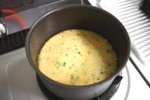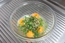 油が熱くなったら、卵を流しいれて、中火弱で焼く。 |