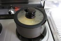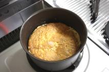 蓋をあけて、卵の縁が硬くなって、ちょっときつね色が見えたら、引っくり返す。 |