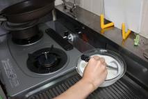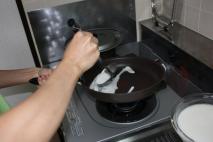 フライパンの表面に薄く油をひき、火にかける。 フライパンを熱したら、おたまで皮の液体を掻き混ぜる。 |