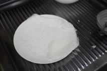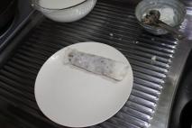 巻き終わった状態。 残りの粉の液体もフライパンで蒸す。 (フライパンが乾いたら、油を薄く塗ってください) |