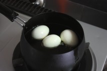 卵を冷たい水で茹でる。 水を沸騰したら、弱火で3分。 火を消した後、そのまま5分置く。 |