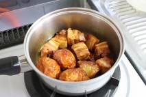 途中で肉と卵を回して、味が満遍なく染み込むようにする。 煮汁がなくなったら、火を止める。 |