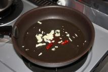 熱した鍋に油をひいて、ニンニクと唐辛子を入れる。 |